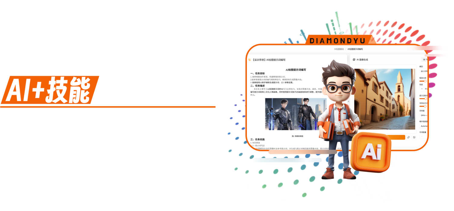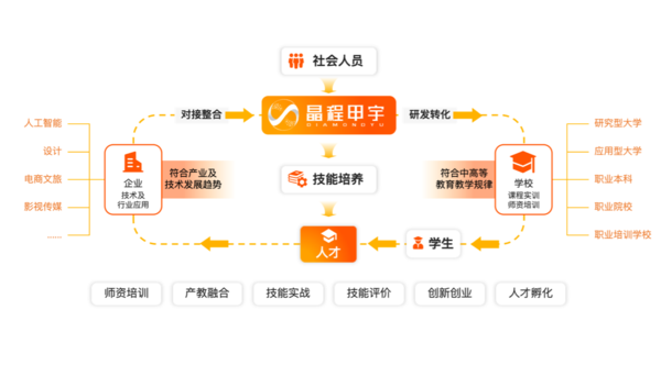 晶程甲宇打造的AI+技能实训平台,整合企业技术及行业应用,覆盖人工智能、营销科技、电商、智慧文旅等多个领域。通过将符合产业及技术发展趋势的知识,转化为符合中高等教育教学规律的课程实训和师资培训,实现技能培养与行业需求的精准对接,助力学生掌握前沿技术应用能力。